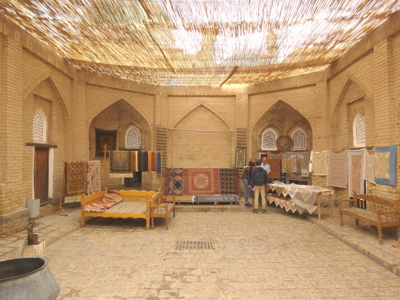 スザニというウズベキスタン伝統の刺繍を買えます。色とりどりのスザニは見ているだけで楽しく、お土産を買うつもりがない人でも楽しめると思います。建物も古いので、味があります。散策の途中で時間があったらよるといいと思います。
