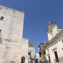 チステルニーノ旧市街への入り口であるトッレ・ディ・ポルタ・グランデの向かい合うように立つのがマドリーチェ・ディ・サン・ニコラ・パターラ教会。