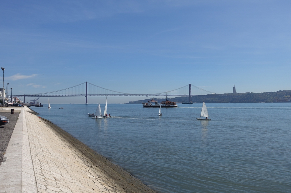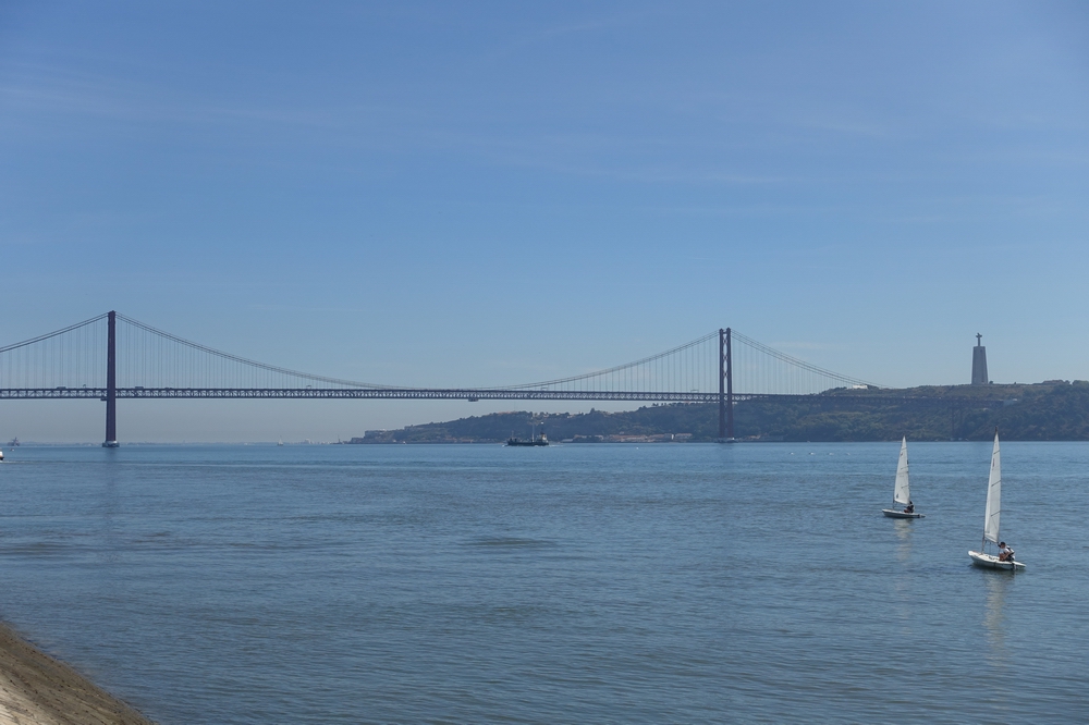 サンジョルジェ城やコメルシオ広場のアーチなど、テージョ川に向かって眺望がきく場所からも見えましたし、ベレン地区を訪れた時には川沿いの遊歩道から特によく見えました。実際の橋は赤い色をしているのですが、やや遠くから見たので「赤」はそれほど感じられなかったです。