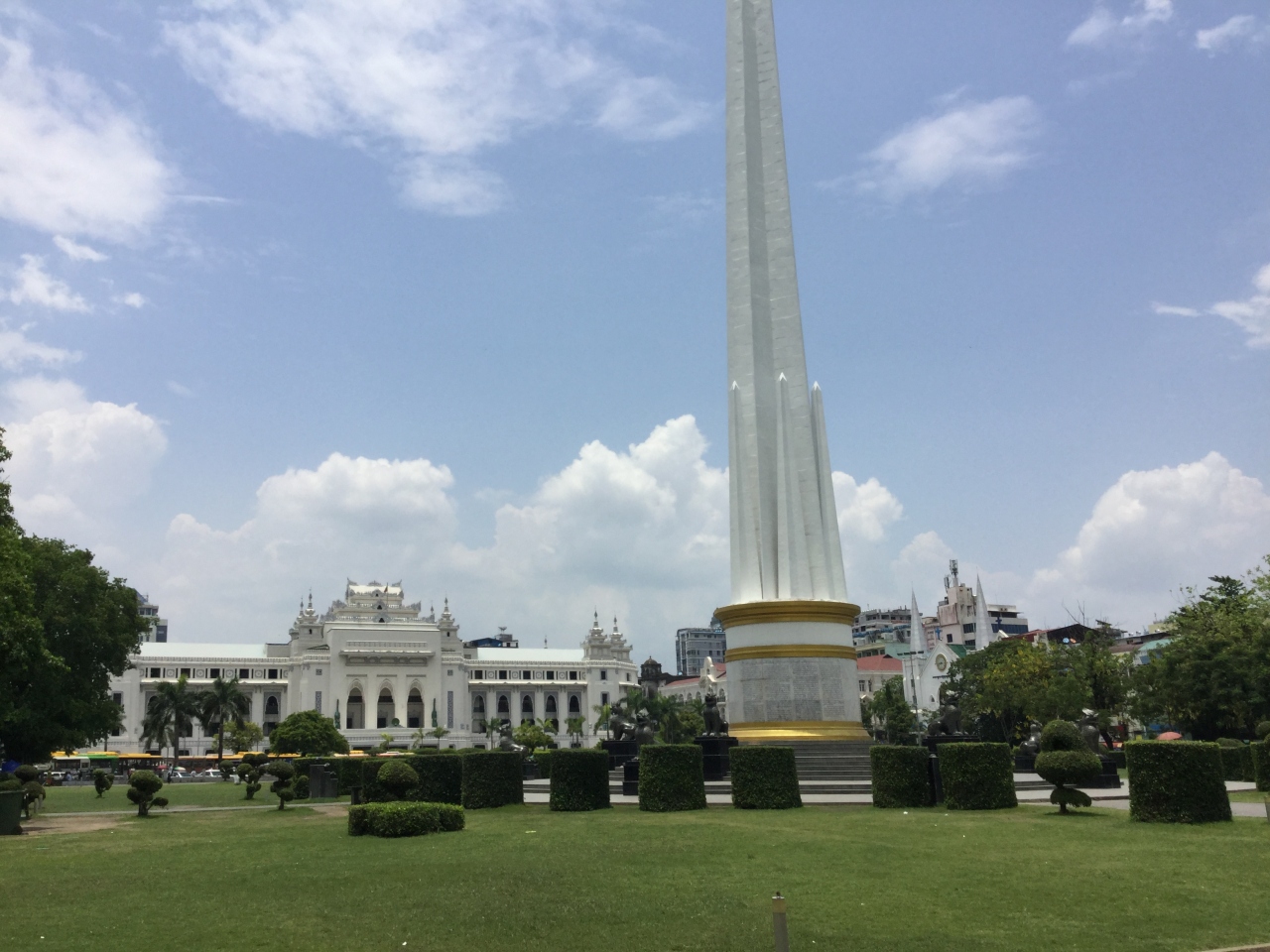 スーレー・パヤー南西側横のマハバンドゥーラ公園内にある。独立記念塔は1948年イギリスから独立した時、記念として建てられたものである。円柱の土台の上に大空に向かって円錐形の太い柱が伸びている。下部にはその周りに短い剣のようなものが並んでいる。全体が白く一部金色のリングがあり、大変美しい姿である。周辺には芝生が広がり、北側には市庁舎の白亜の建物などが見える。独立記念塔はミャンマー国民にとっても重要なものであり、また美しいので、是非とも園内の日陰に入りゆっくり見る価値がある。