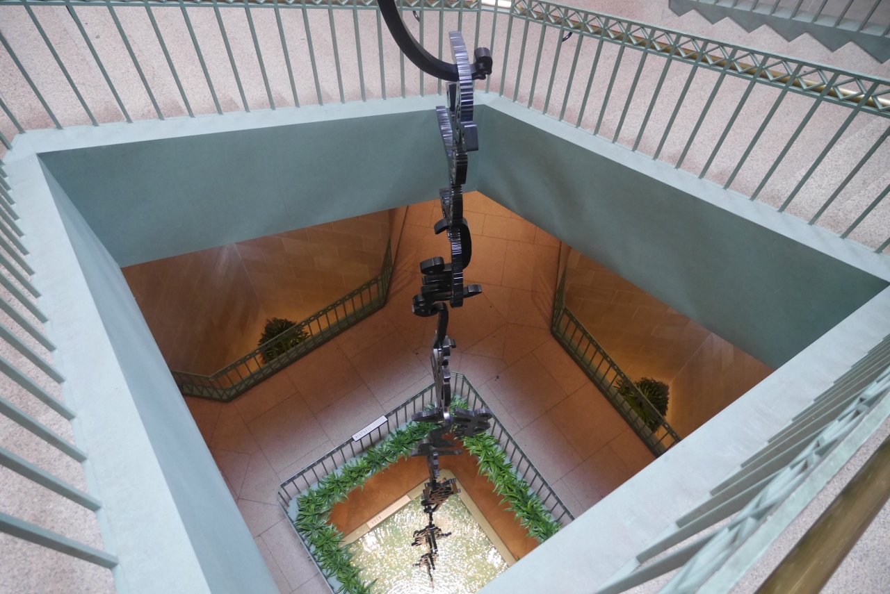 地下3階まで見下ろせる階段空間には自在鉤のような下げ物が飾られ、その下には池があり、不思議な空間を形作っています。