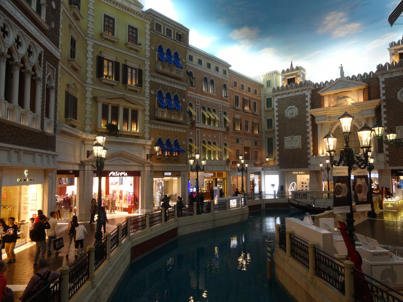 巨大カジノです。カジノはもちろんのこと、ショッピングモールエリアも楽しいです。こちらはお子さんでも入れるので、ファミリーにもおすすめです。ヴェネチアの街を模していて、水路でゴンドラに乗ることもできました。