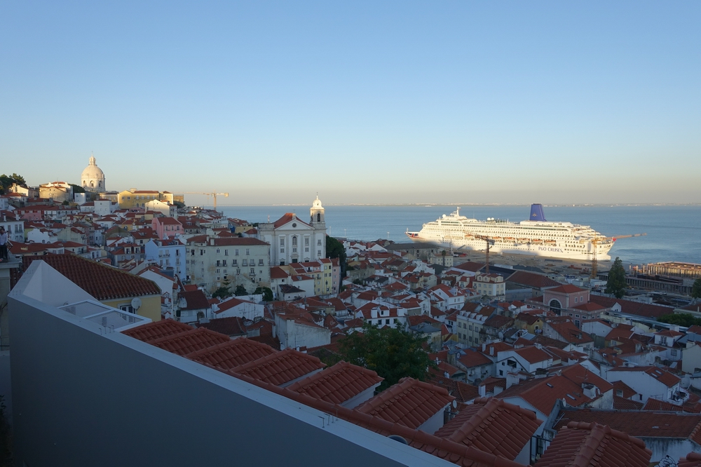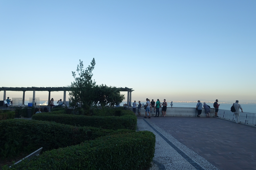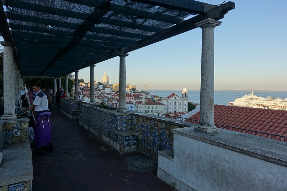 単なる展望台ではなくて手前が小さな庭園のようになっています。そしてさらに手前には同名のサンタルジア教会があるのが目印です。テージョ川には大型客船が停泊中。19時頃に行ったので、絵を売っている人たちは片付けを始めていました。