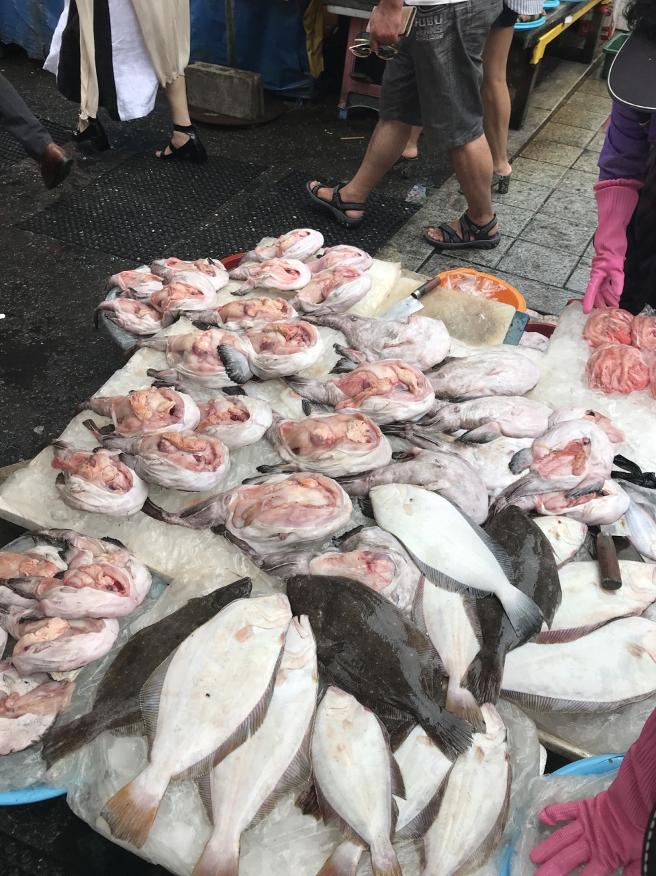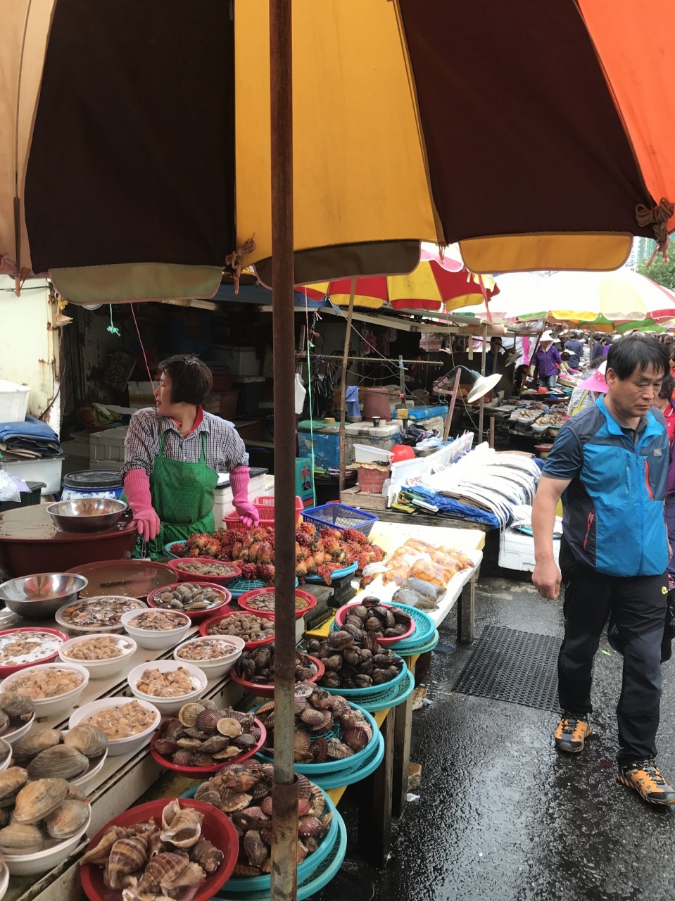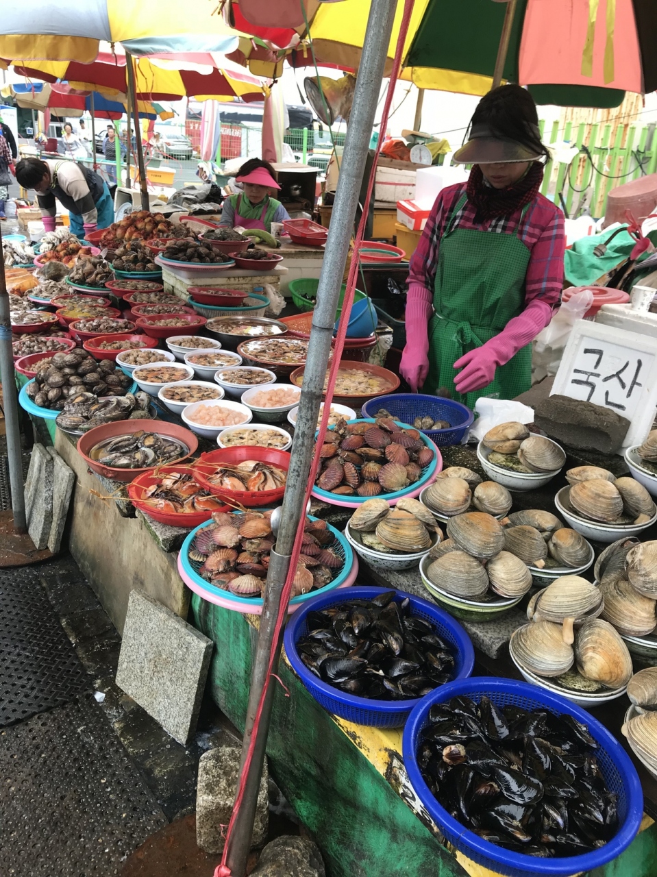 日本ではもう見られないような魚市場です。ずらりと太刀魚、タコ、シャコ、貝が並んでいてぴくぴく動いているので新鮮そのもの。タコが逃亡しようとしてました。魚もその場でさばいてくれるようです。周辺には焼き魚、乾物などの商店も並んでます。