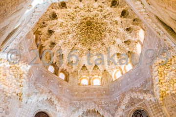 ライオン宮にあるホールの一つです。ドーム状になっている天井に施されたレリーフの彫刻が見事すぎます。他の部屋同様、ここの彫刻にもカラーリングはされていません。天井だけでなく壁にも見事な彫刻が施されています。