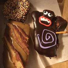 人気メニューのメープルベーコンとブードゥー人形のドーナツ、あとナッツぎっしりのドーナツを買いました。箱も可愛いです。メープルベーコンはベーコンの塩気とメープルの甘さが上手くあってて意外な味で人気あるのが納得です。ブードゥー人形は中に血に見立てた赤いジャムが入ってます。