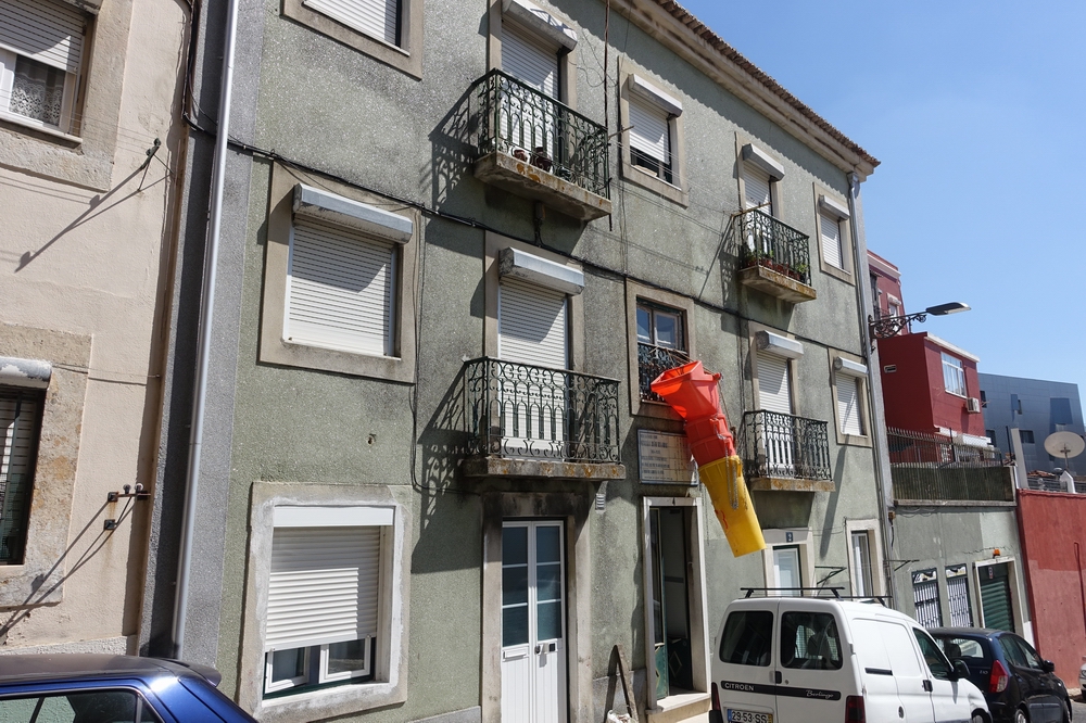 建物入口の上にアズレージョで説明書きがあり、日本語とポルトガル語で書かれていました。自分が行った時は見に来ている人は誰もおらず、工事で使うようなコーンかバケツみたいなのがぶら下がっていて景観も雰囲気もいまひとつ。今も住んでいる人がいるため中には入れず外観のみとなります。