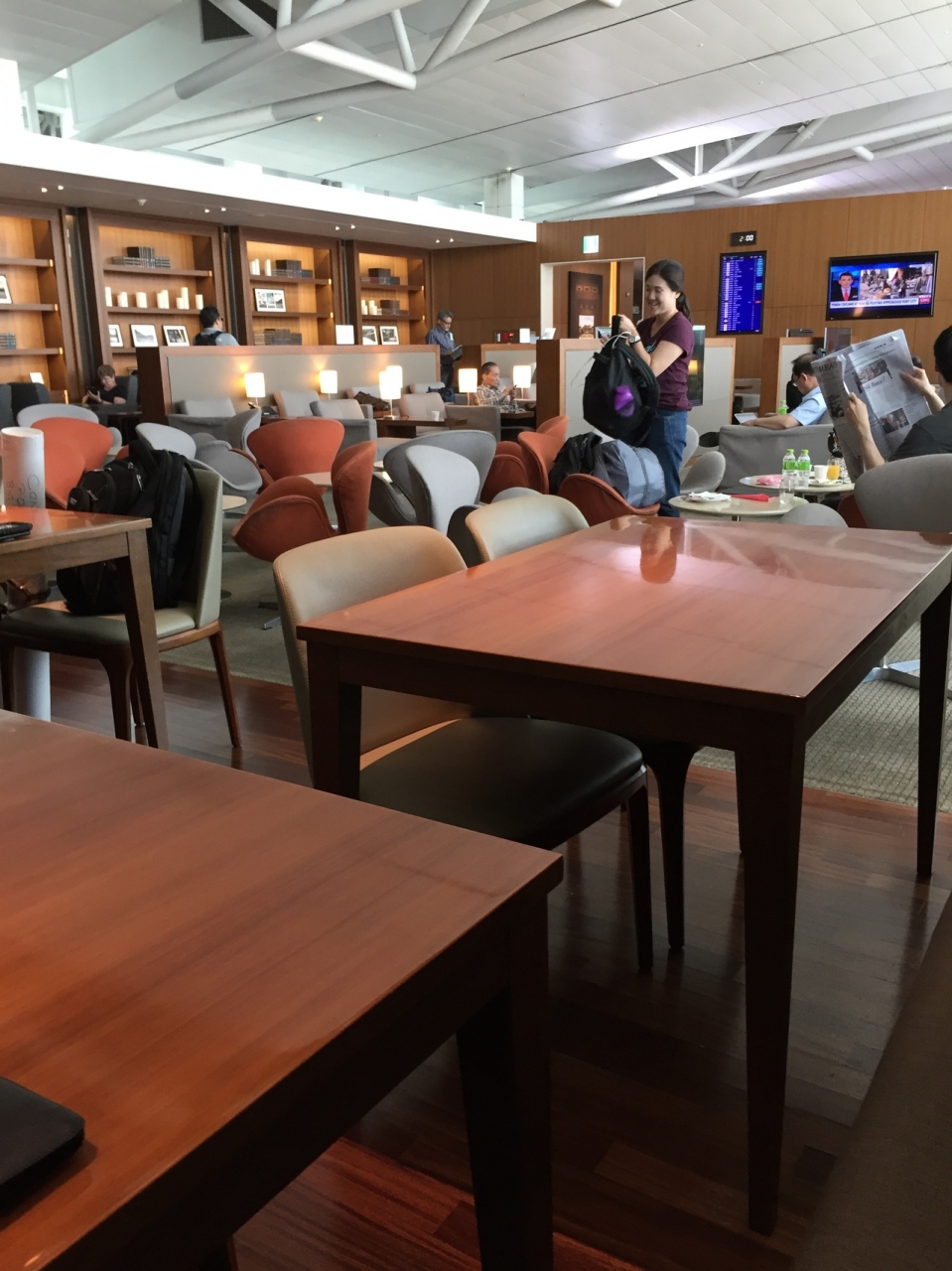 広くてゆっくり出来ます。食事もサンドイッチ、生野菜、パンなど十分に揃っています。もちろん韓国のカップラーメンやお酒の類も豊富です。出発時刻が近づいても日本のように案内のアナウンスがあるわけではないので注意が必要ですが、静かで良いと思います。