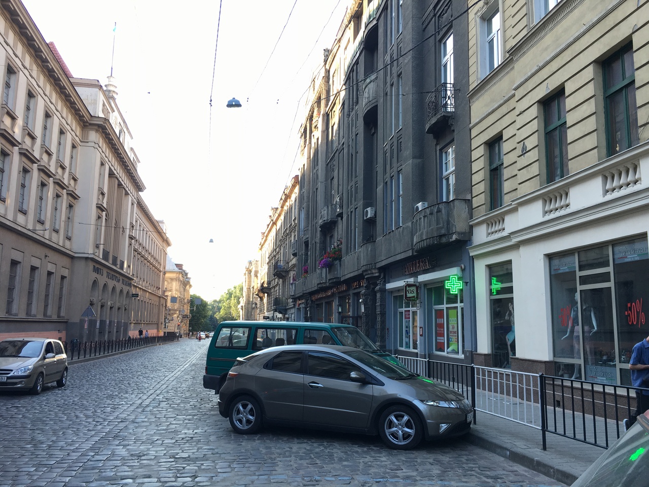 正式名称をミコリィ・コペルニカ通りと言い、リヴィウ旧市街地の南西から新市街地へと伸びる中規模の通りです。P.ドロシェンカ通りと平行に並んでおり、P.ドロシェンカ通りが旧市街地→新市街地へ、コペルニカ通りが新市街地→旧市街地の一方通行となっています。