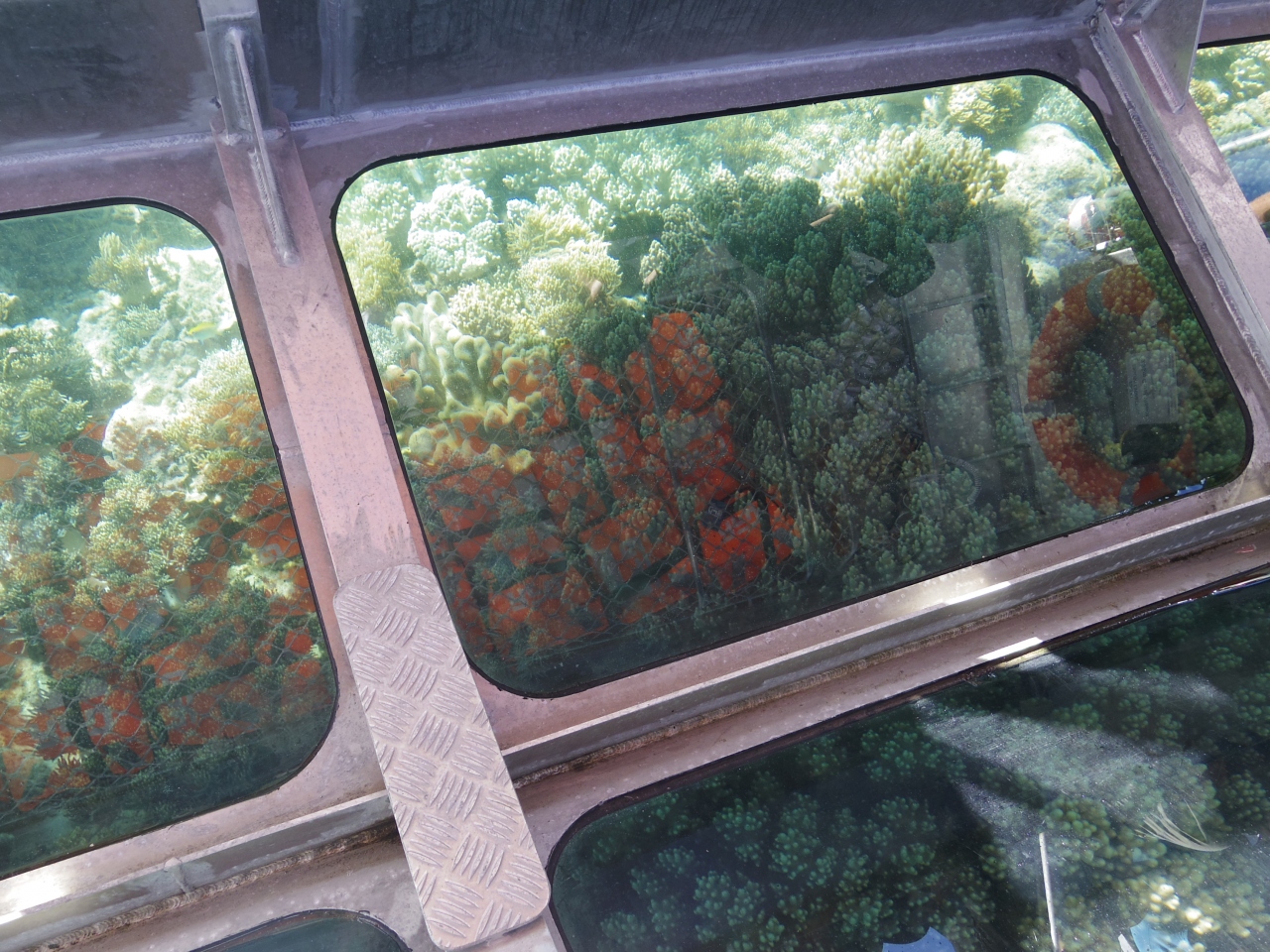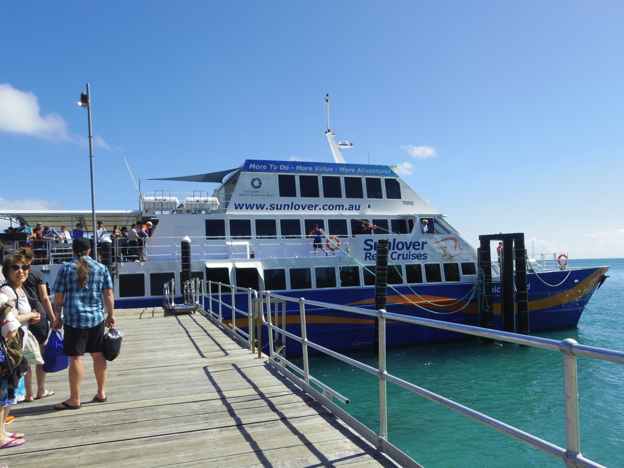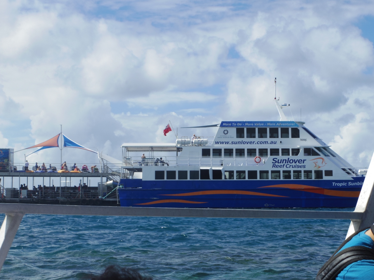 ケアンズのリーフ・フリート・ターミナルにある、サンラバークルーズ社のカウンターで手続きをし、8時半に出航する船でフィッツロイ島へ。島内を1時間散策して船着き場に戻ると、サンラバークルーズと書かれた別の船がやってきてムーアリーフへ向かいました。