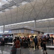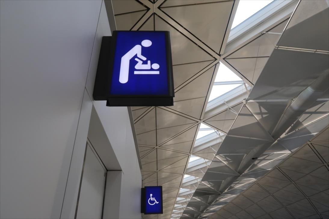 香港に住んでいるため、何度か0歳児の娘を連れて利用しています。赤ちゃん連れでもゲートのそばにいくつかおむつ換えや授乳ができるところがあります。お手洗いにも男女問わず、おむつ換えの台があるので便利です。出国前の手荷物検査は子連れ優先の列があるので、急いでいるときはそちらも利用できます。