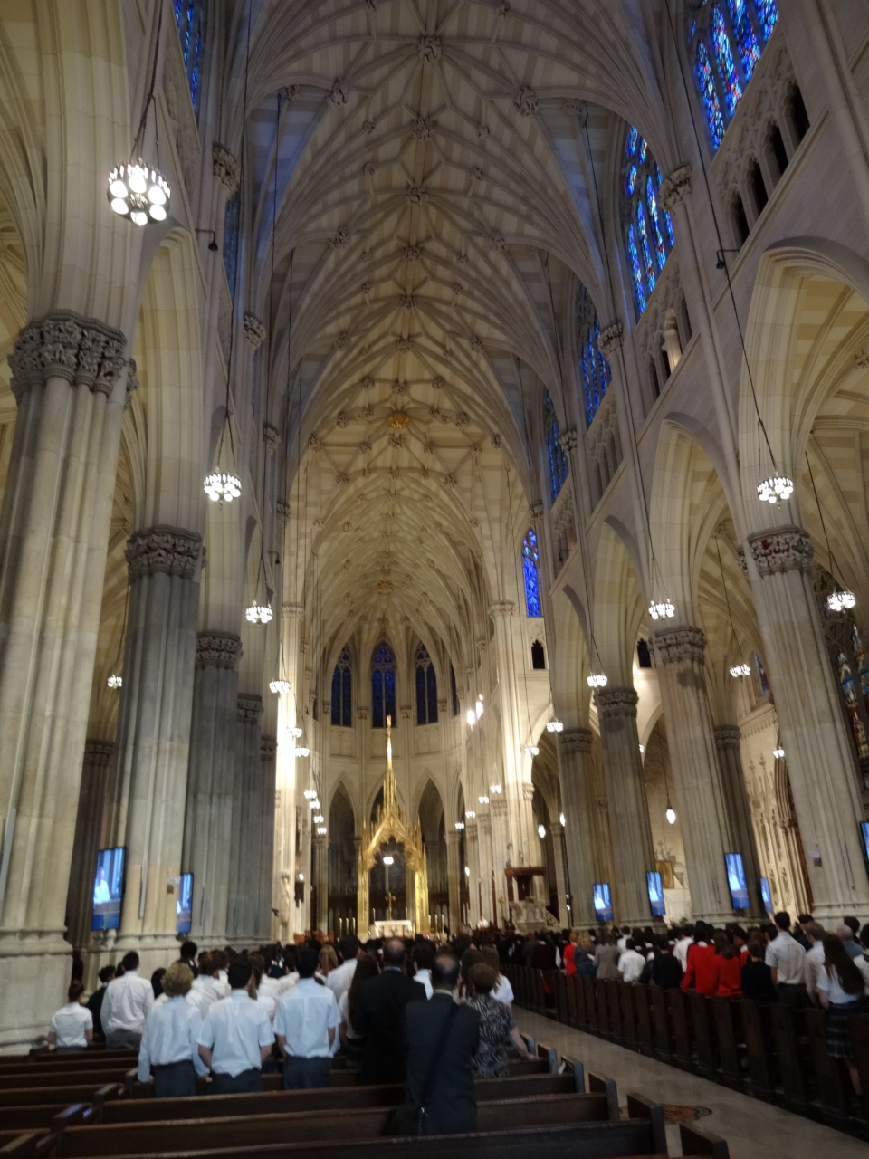 ここは、世界的に有名な5番街通り(5th Avenue)、向かいのロックフェラーセンターという超高層ビルははじめとした大都会のど真ん中にで歴史を感じるゴシック建築の大聖堂でアメリカ国内で最大のカトリック教会。ミサの最中であったが、ここが都会の中心であることを忘れてしまうほど落ち着いた雰囲気だった。窓のステンドグラスも綺麗だった。