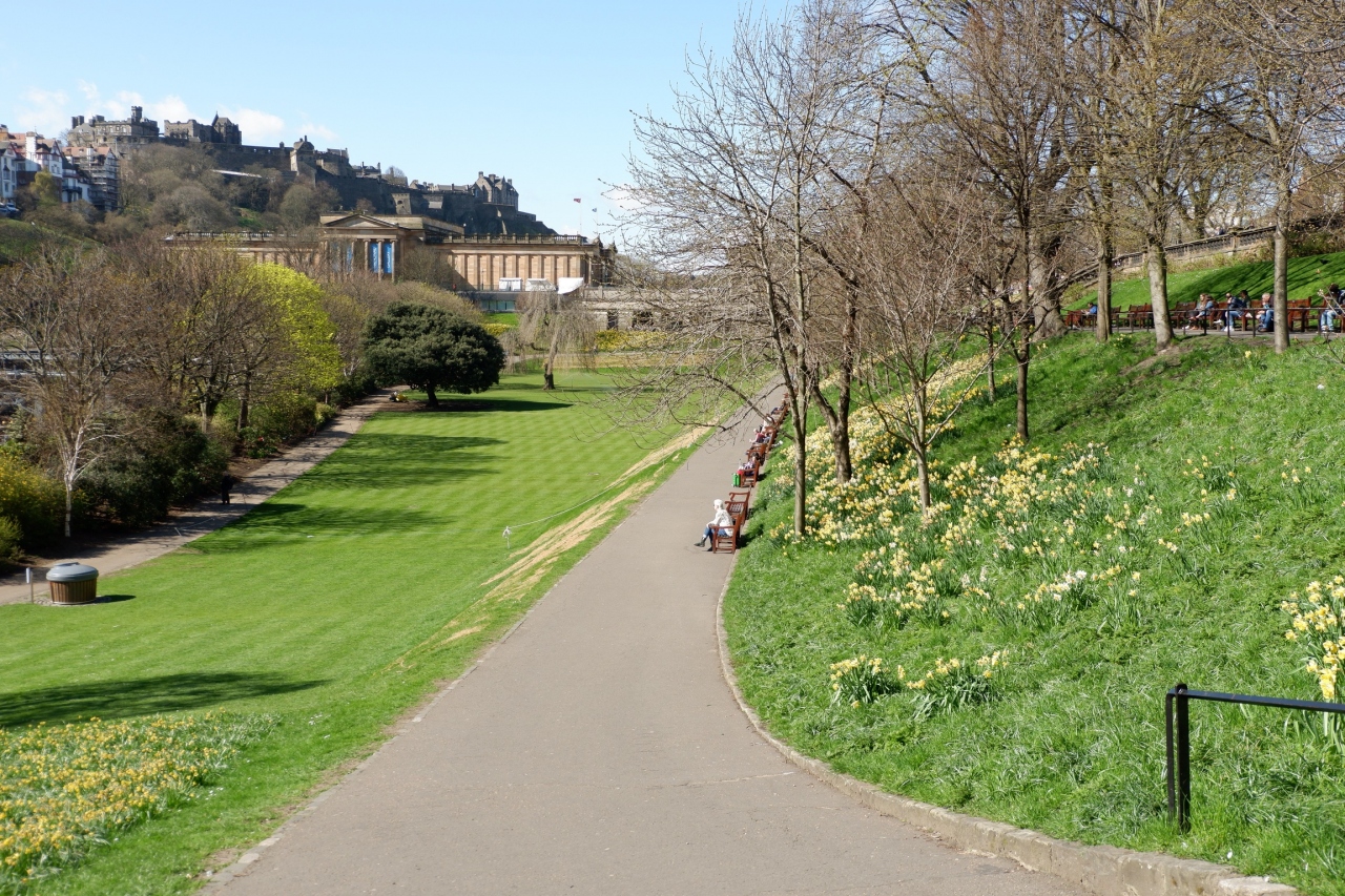 通り沿いの公園は春に一面黄色いラッパ水仙咲き、緑の芝生も清々しいです。遠くにエジンバラ城も望めます。清掃もとても行き届いており、ベンチもたくさんあるので、観光で歩き疲れたらゆっくり休憩するのにぴったり。通りの反対側には、大きいデパートやスーパー、ファストファッション店が並び、観光客向け小規模なお土産店がメインのロイヤルマイルよりもっと地元の方達も利用するお店が見られます。
