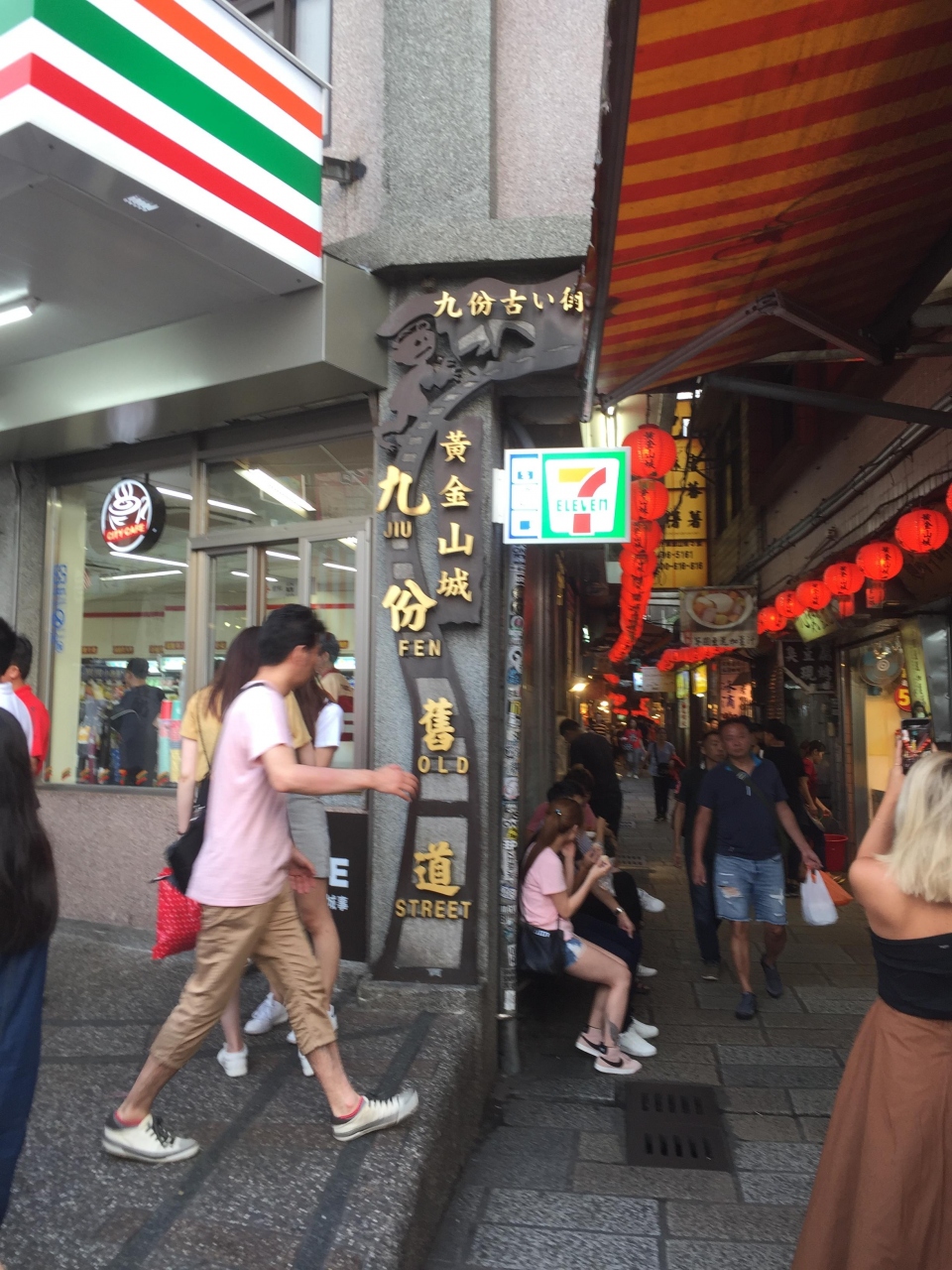 セブンイレブンの横から、九份のメインストリートである基山街が始まります。それほど広くない道ですが、大勢の観光客が歩いています。道の両側には、お店がびっしり!お土産屋さん、食べ物屋さんが呼び込みをしてとても賑やかでした。時々、軽トラがやってきてビックリ!