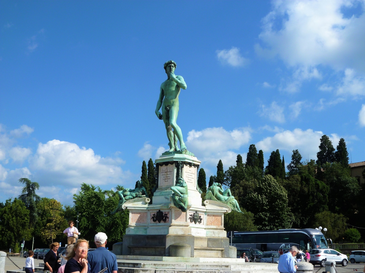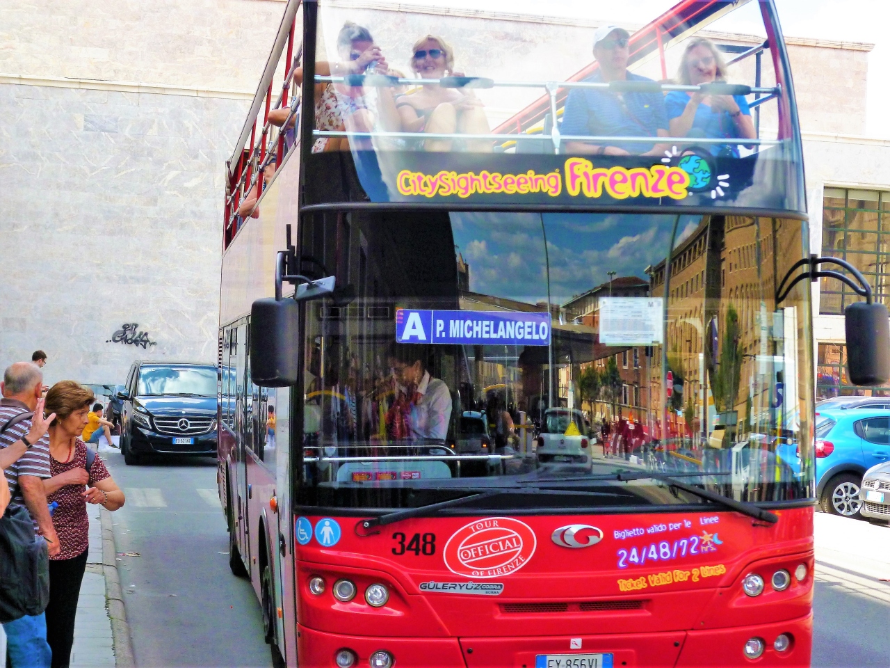 ホテルのフロントに聞いたら「`ローマ オープンバスツアー;24時間の乗降可`がフィレンツェでもありますョ!」 で、駅前にチケット販売員(事務所)がいました…Aコース;駅発/30分間隔/市内中心部各所、Bコース;ミケランジェロ広場発/30分間隔/市内外各所…両方自由に利用可。 当然、チケットを!人気が有って15人前後/30分が待っていました(後で調べました https://www.veltra.com/jp/download/pdf/106105/1/504388)。
