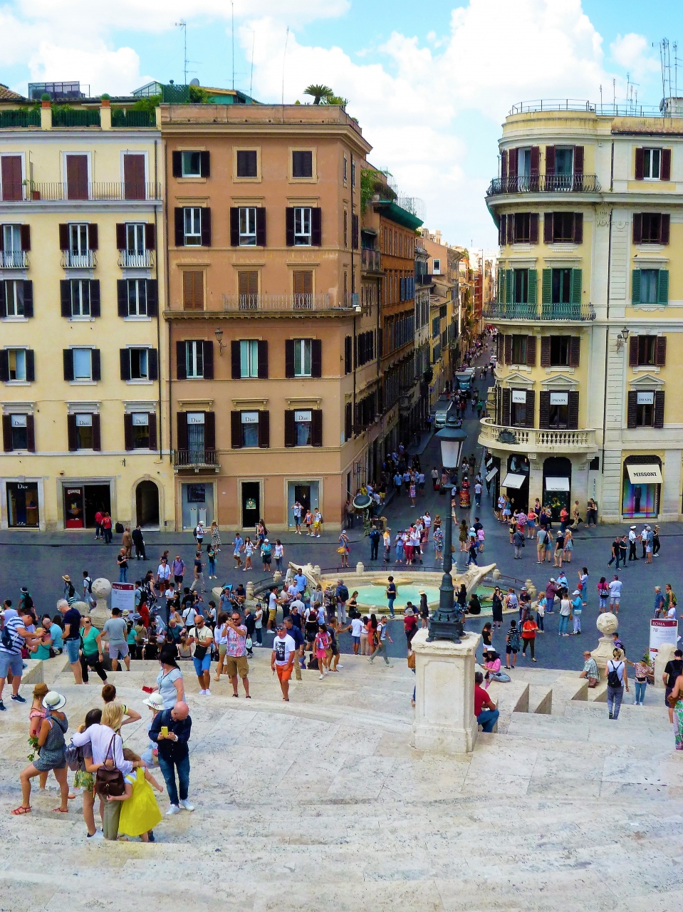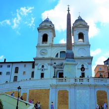 朝一番にスペイン広場に行きました。大階段を登って[トリニタ デイ モンティ広場]/白い教会の前にオベリスクがあって洒落たフェンス付の広場です。好天で!見晴らしが良く、手前には`舟の噴水`(当然ですがスペイン広場の様子)、その向こうには両側の6階建ビルが並んだ商店街=コンドッティ通りがくっきりと!