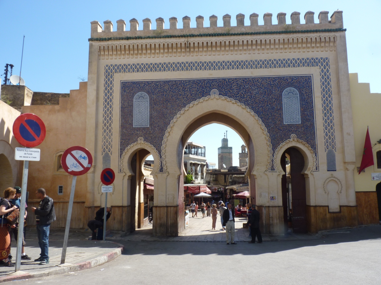古都フエズのメデイナへ入る門の一つでここで車を降りて門を潜るのだが門の脇には銃を持った警官?兵士が立っておりカメラを向けないよう注意があった。入り口側はブルー系のモザイク画で彩られ、門を久々津手裏側にはグリーン系のモザイクで装飾されているが意味不明!