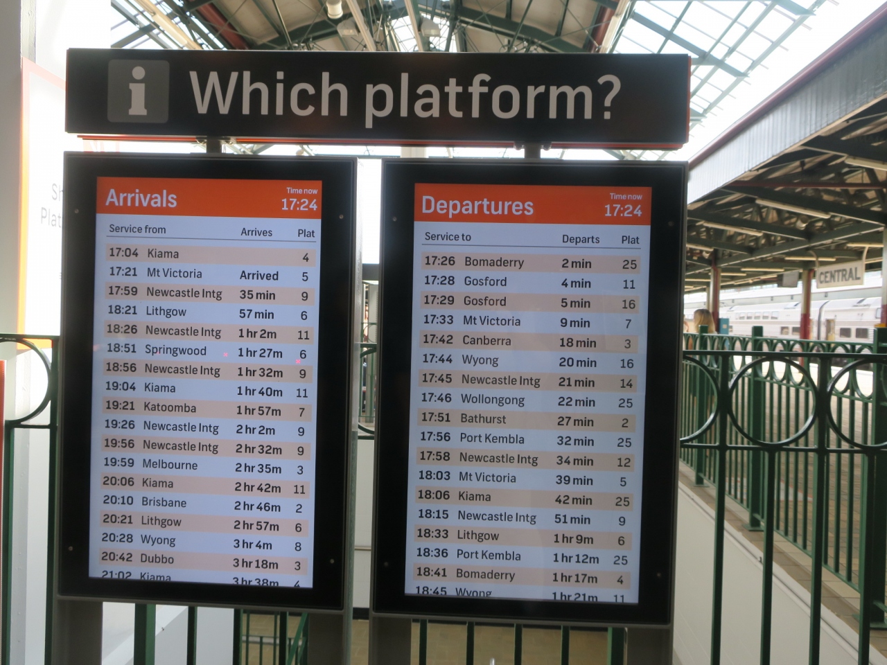 空港からのエアポートリンク、サーキュラーキーへのシドニートレインズ、ブルーマウンテンズからのNSWトレインリンクと沢山のプラットホームがあり、どのプラットホームを使うのか自分でモニターで確認するのが大変でした。