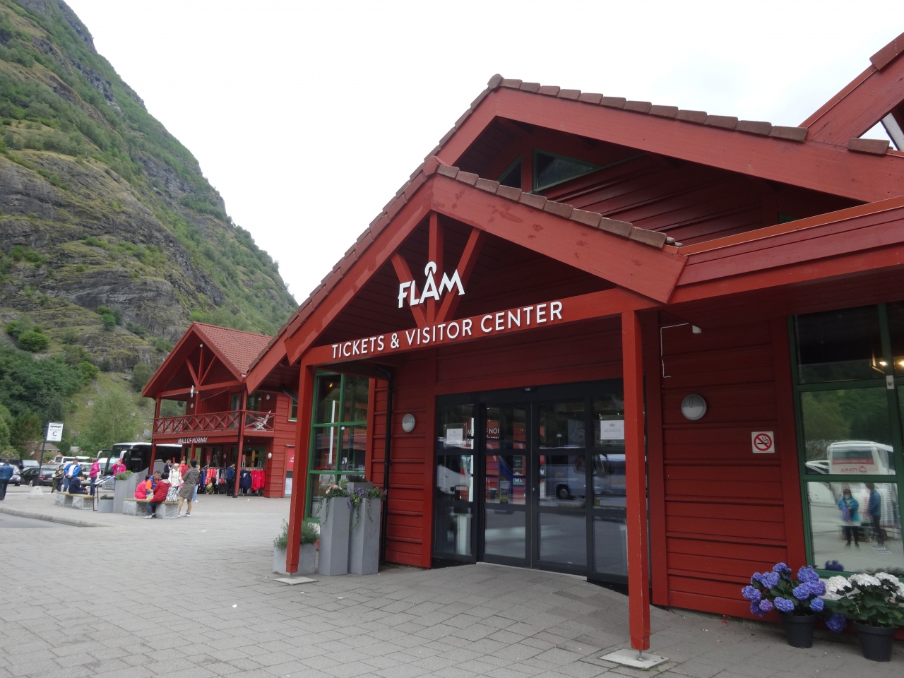 フロム鉄道の終着駅です。おりると目の前にフィヨルドが広がります。ホームは構内があるような感じではなく、改札もないのでちょっとそわそわしましたが、とても賑わっていてとても雰囲気のいい街です。駅のすぐ前には大きな案内所兼チケット売り場があります。すぐ近くにスーパーもあるので買い出しにも便利でした。