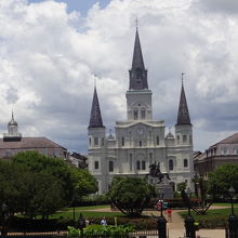 川縁の少し高い所から公園を見ると、ニューオーリンズの英雄の騎馬像が中央に見えその背後にセントルイス大聖堂が美しい姿を見せている。