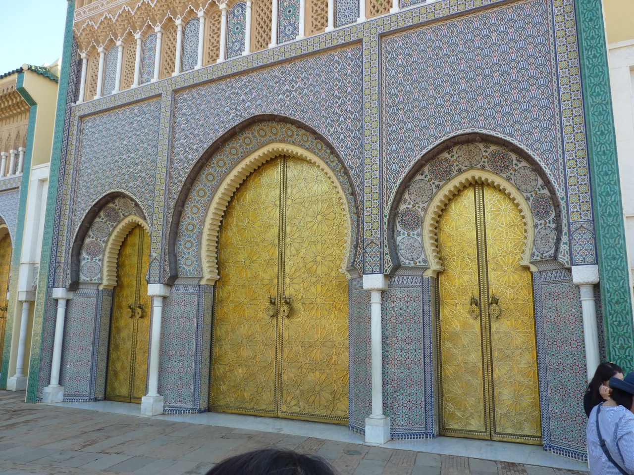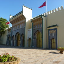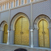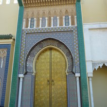 バスを降りるといきなり2人の警備兵(兵士)?が銃を持ってこちらをにらみつっけている。ガイドより決してカメラを向けないようにと注意を受ける。緊張感とは裏腹になんと美しい幾何学模様を施したマリーン朝の王宮で門扉は黄金で輝いている。13世紀に建てられ現在も使用されているが一般公開はされず正門のみの撮影許可であった。