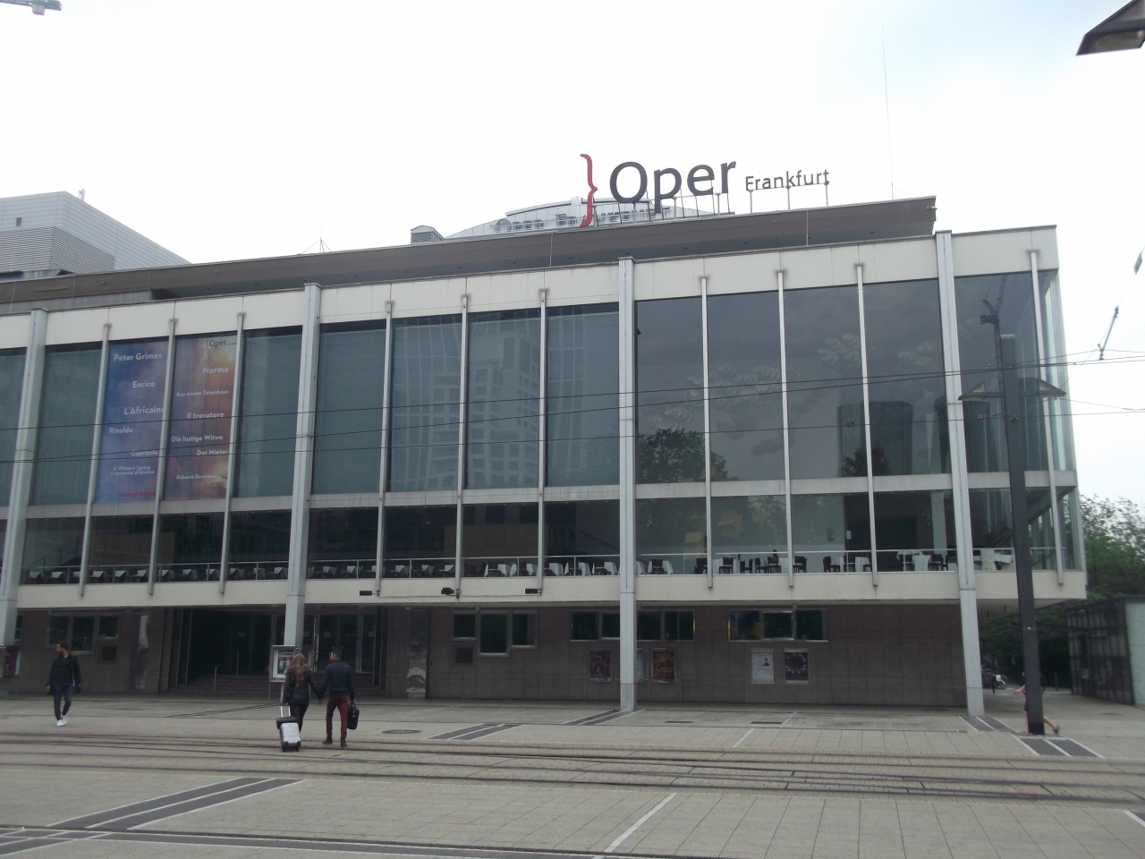 中央駅から歩いても10分ちょっとぐらいの距離ですが、ここのすぐ目の前に止まるトラムの利用が便利です。オペラハウスというとパリやミラノなどの重厚な雰囲気の建物を想像しますが、こちらは新しいのでガラス張りの現代的な建物です。旧オペラ座アルテオペラは、マイン川とは反対方向に20分ほど歩いたところにあります。
