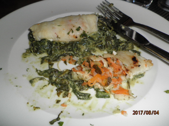 シュタインゲンベルガ―ホテルのレストランです。少し遅めのランチを食べに行きました。ランチのセットを頼んだのですが、メインは魚料理にし、デザートかスープを選ぶということでした。ホテルのレストランですが、割とカジュアルな感じで食事ができました。