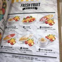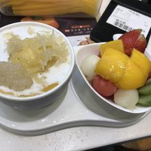 「pomelo&mango with sago&bird’s nest」を注文。フルーツ盛り合わせ(マンゴー、イチゴ、メロン、すいか、キウイ)とポメロ、マンゴピューレ、マンゴーアイス、ツバメの巣が少しシャーベット状のソースに入ったデザートのセット。フルーツは最初に食べたほうが良い。
