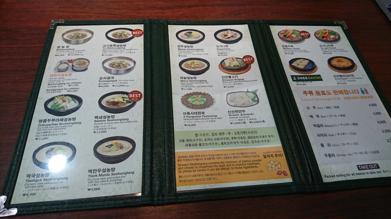 ソルロンタン(8000W)にはご飯がついてプルコギ(14000W)はご飯なしでした。