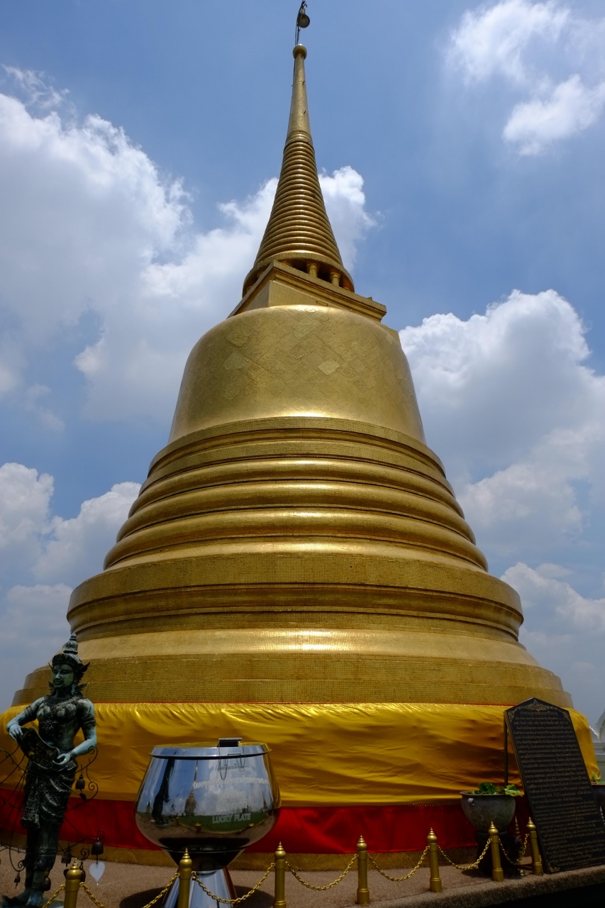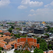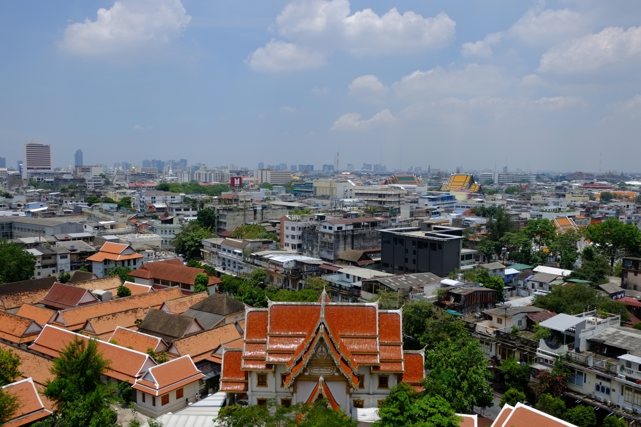 プラトゥーナームから出ている運河ボートの終点から歩いて行くと便利です。黄金の仏塔まで仏像などを眺めたり鐘を鳴らしたりしながら歩いて登れば、楽に高台の上まで着きました。周りに高い建物はないので、バンコク市内を広く見晴らせました。