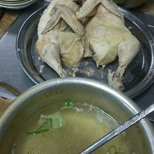 別盛りで大きなお鍋に鶏のスープ、鶏はさっぱりとしていて、そのままいただいても、お塩でいただいても、辛いお味噌をつけていただいてもおいしかったです。
