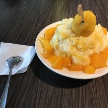 かき氷はさっぱり系。マンゴに余計な甘みをつけていないせいかも。フレッシュマンゴーの甘みと重ならず良い。