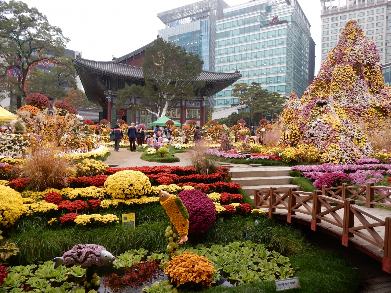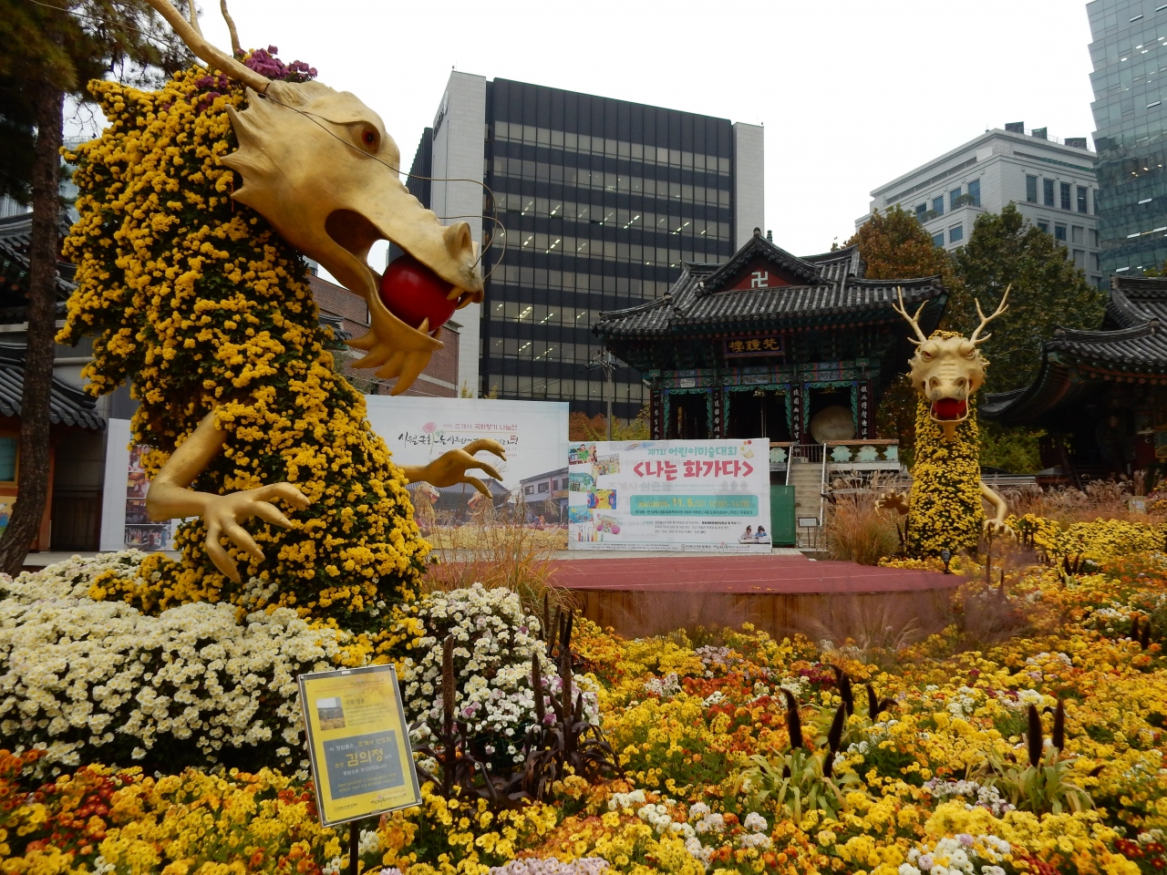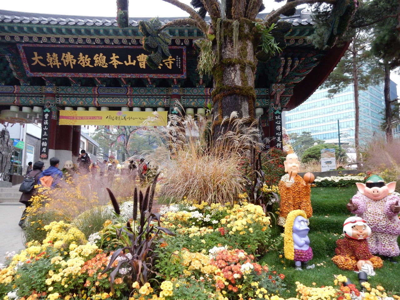秋の清渓川ランタンの時期にしか行ったことがないのですが、この時期はお寺の入口から境内まで菊を中心に非常にきれいに飾られており、しかも入場は無料。