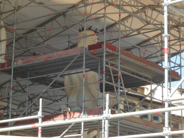 フィレンツェのシニョーリア広場にある、有名な噴水です。たまたま修復中で、逆に珍しい気がしました。逆に、こうして覆われた部分から出ているところを見ると、かなり巨大な建造物であることが分かります。広場自体が広いので、その大きさが、あまり目立たないのですね。