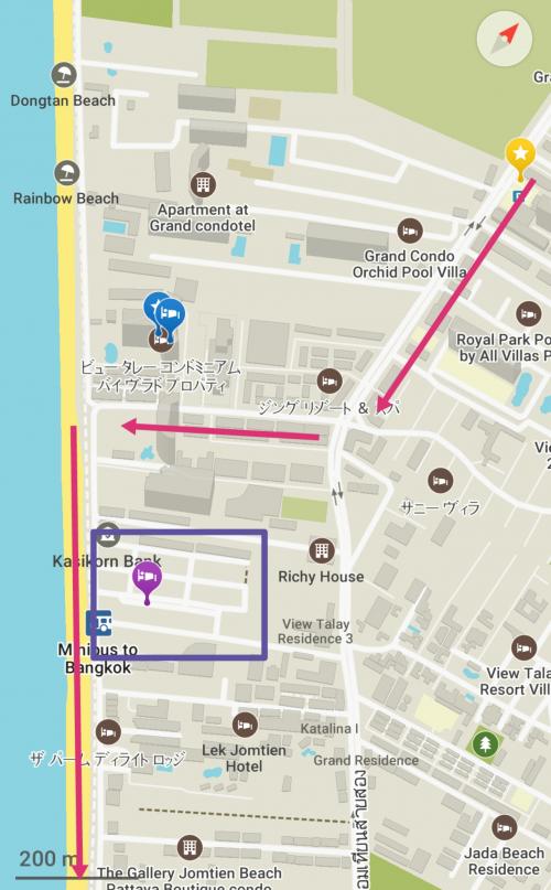 ★Jomtienの空港行きバスステーションはJomtien市街中心から500~800m程で歩いても行けますが、パッタヤ行きソンテウの通り道なのでソンテウが便利です(10TB)。