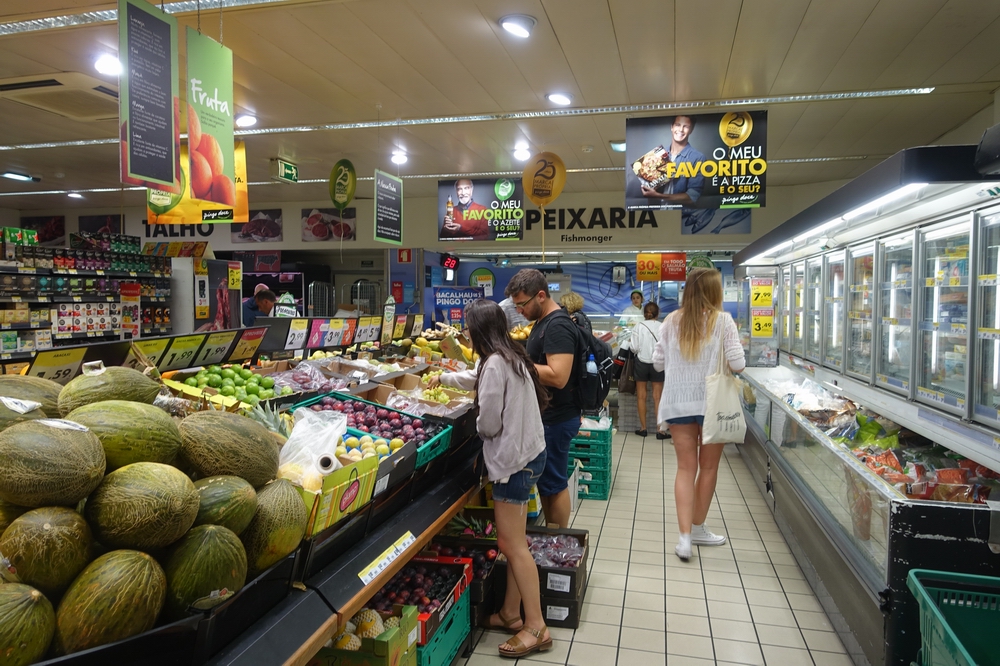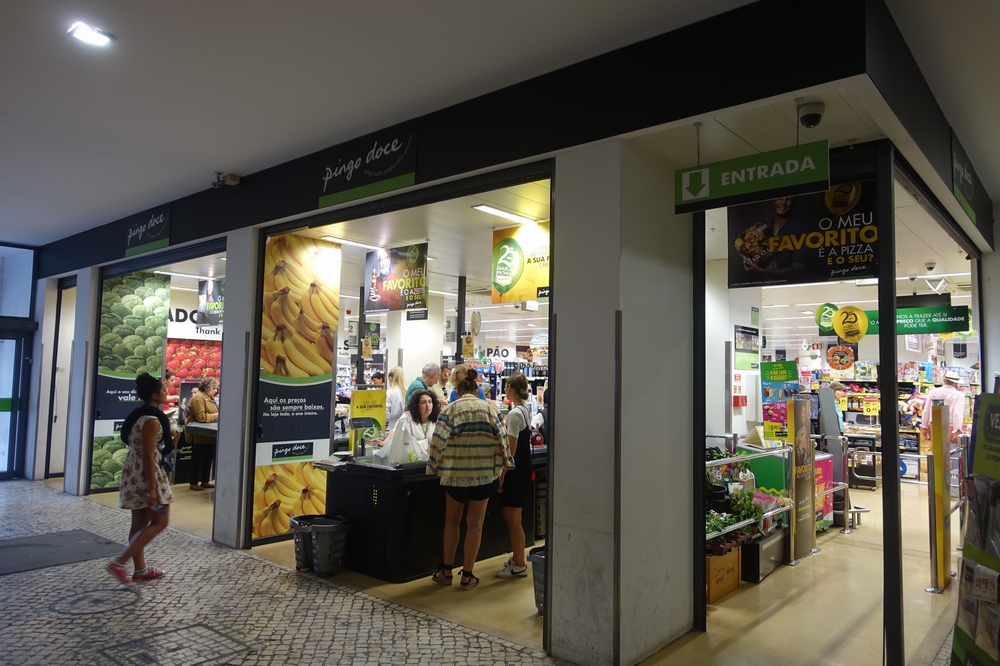 ピンゴドーセはポルトガルのあちこちで見かけるスーパーマーケットです。観光客が滞在するリスボン中心部には意外と少なくて、一番行きやすい立地にあるのがロシオ広場近くのこちらの店でしょう。そのため観光客もたくさん来ています。店自体はそれほど広くなく通路もちょっと狭いかなと感じました。
