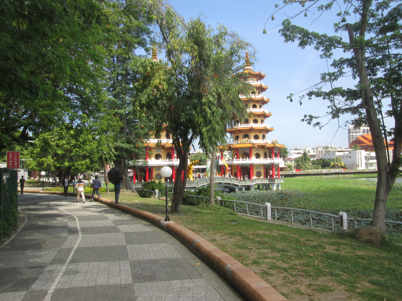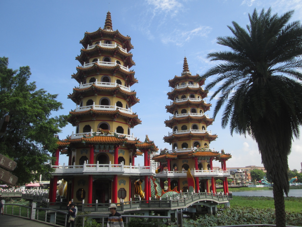 蓮池潭風景区のもっとも見学すべき観光スポットです。竜と虎をモチーフにした龍虎塔です。高雄旅行のパンフレットでも見かけるツインタワーです。この湖畔にはかなり特徴のある建造物、寺院がありましたが、実際に訪問するとこのタワーが見た目のインパクトが抜群で、ひと際目立っていました。