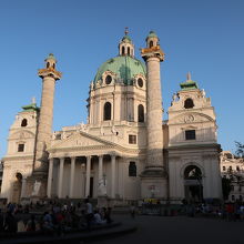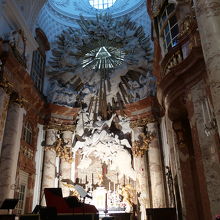 カールス教会へは、コンサートを聴くために訪れました。外観も素晴らしい建物ですが、内部はもっと豪華でした。こちらの教会は、カール6世が造らせました。バロック建築です。内部には、楕円形のドーム天井があり、そちらはロットマイヤー作のフレスコ画です。修復のため、足組が組まれているのが残念ですが、そちらのエレベーターに乗って、天井画を近くで見ることができるようです。