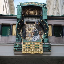 「Hoher Markt広場」の北東ふたつの建物をつなぐ通路にある仕掛け時計。毎正時に一人ずつ、ウィーンゆかりの歴史的人物が現れます。でも、12時には、12体の像が音楽に合わせて登場するので、その時間が一番おすすめです。ちなみに、11時は「マリア・テレジアと夫のフランツ・シュテファン」、12時は「ハイドン」でした。