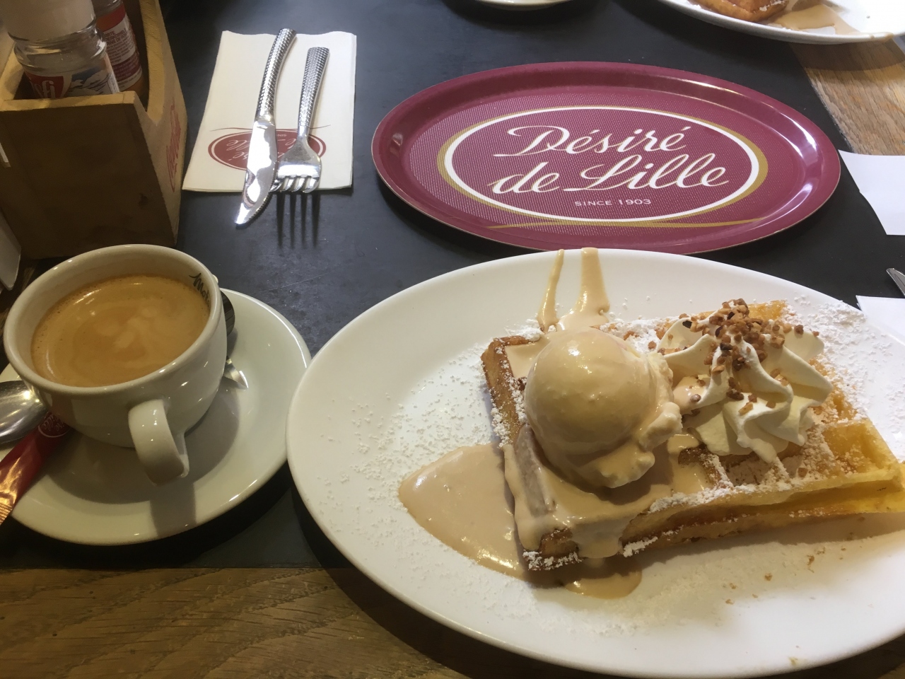 日曜日の15時ごろ行ったので店内はほぼ満席状態でした。アントワープでは有名なカフェで、ワッフルだけでも12種類以上あったのを覚えています。一部のメニューは写真付きのメニューだったため、見た目もわかりやすかったです。店名がそのままメニュー名になったアイス付きワッフルを注文しましたが、ふわふわのワッフルと冷たいアイスが絶妙でした。