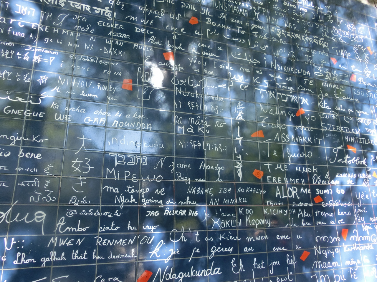 様々な言語で愛の言葉が書かれています。私はいつも日本語で「大好き」と書かれているところで写真を撮ります。青い壁に白い文字がおしゃれで、写真スポットとしてはおすすめです。私が訪れた時には校外学習なのか、小学生が写真を撮ったりレポートを書いたりしていました。