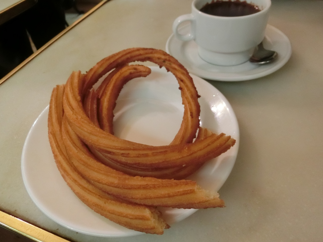 朝8時頃に行きましたが、行列ができていました。1階のカウンターで注文して、下の階の席で、料理が届くのを待ちます。届くまではレシートは持っておいた方が良いです。チュロスは揚げたてでサクサクで美味しいですが、ほとんど味がないので、甘いホットチョコレートとよく合います。スペインらしい朝食になりました。