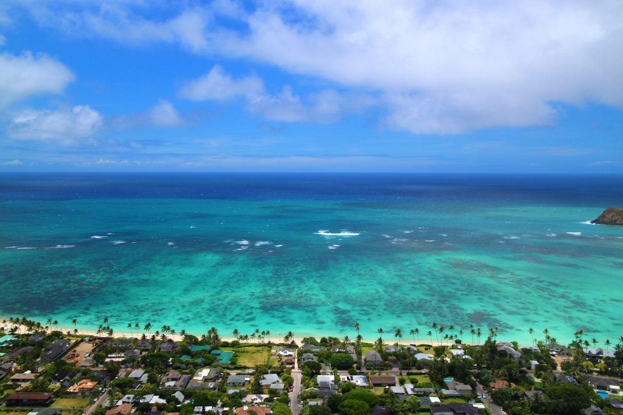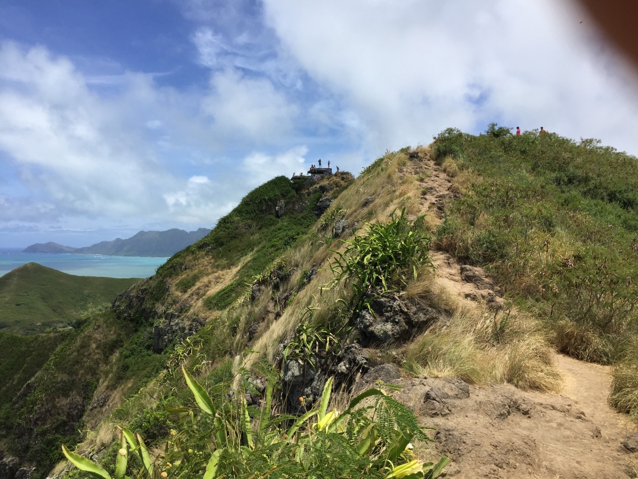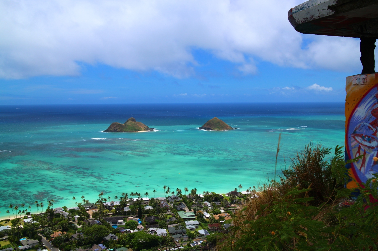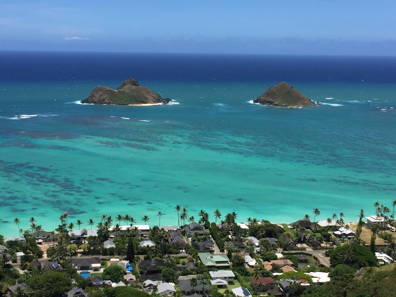 70番バスのラニカイ入口の停留所から100m位上がったところに入り口がある。若い人たちに結構人気があるので混みあうほどではないが、前の人の通ったところを目指して上るといいようだ。場所によっては急斜面なので登りよりも下りがすべりやすいのでビーサンでは無理だと思う。30分ほどで1番目のピルボックスにつくがここからでも180度見渡せる絶景ポイント。体力のある人は2番目のピルボックスへ行くが高さ的にはそれほど変わらないのでここから引き返した。