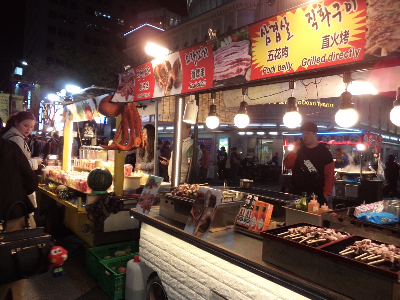 夕方に行きましたが、駅を出たところからもう凄い人出で、人の波について行く状態。 道端には好き勝手に露天みたいなのが出てて、面白ソックスを売ってたり、屋台でお料理を売ってて、まるで毎晩が夏祭りみたいな感じですね。 イメージ的には、東京・池袋のサンシャイン通りの賑わいを想像していただければだいたい分かると思います。 あんな感じです。