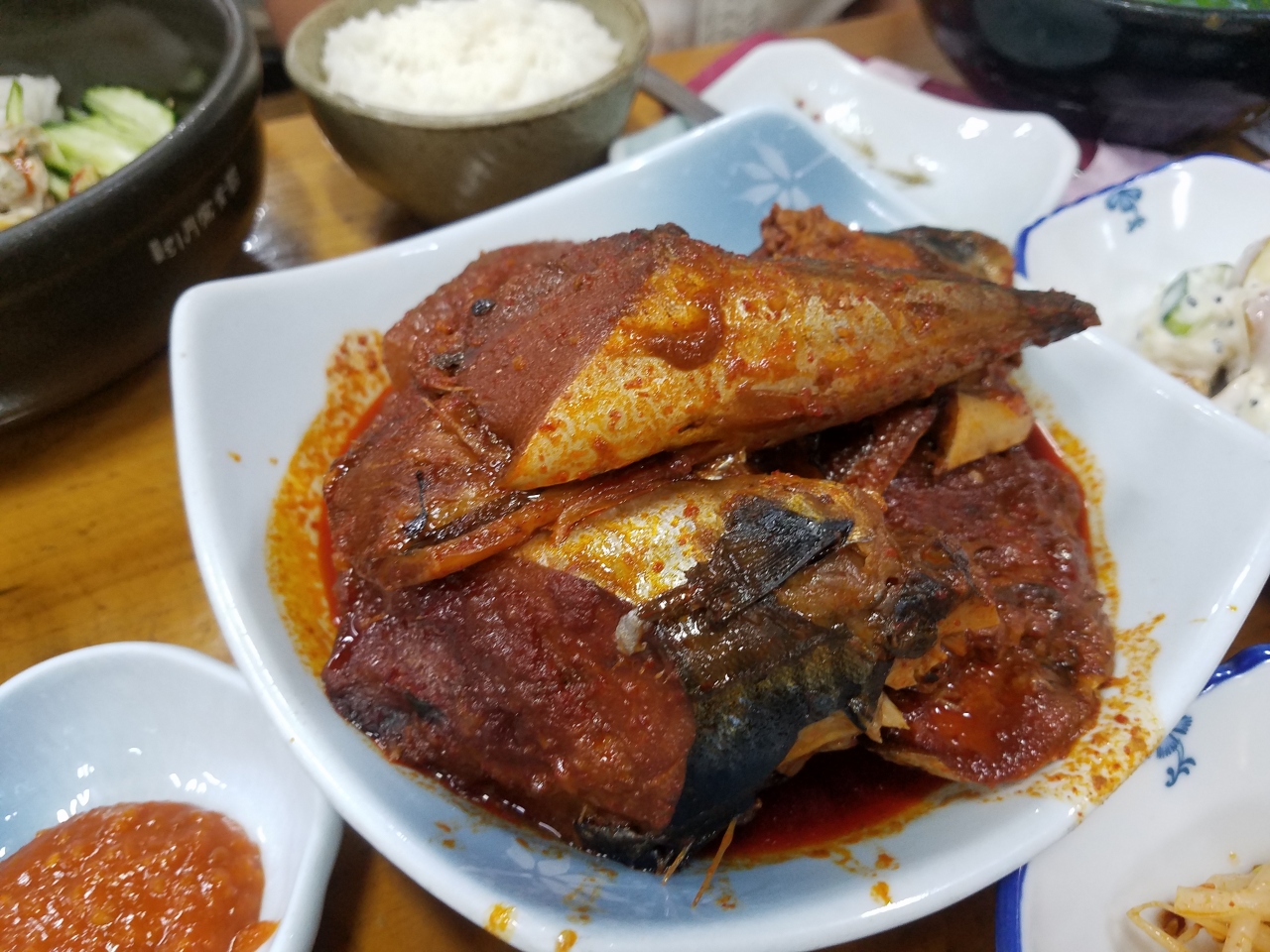 朝食時に訪問しました。近くに宿泊している日本人観光客で満席です。シジミ定食とシジミビビンパプを注文。シジミの身がたっぷり入ったスープが、飲み過ぎで疲れた胃に染み渡るようです。鯖の煮込みなどおかずも充実して、朝からおなかがいっぱいになりました。