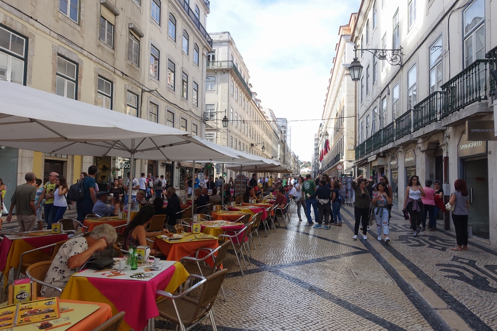 1755年のリスボン地震のあと、碁盤の目状に整備された場所で、大まかにロシオ広場とコメルシオ広場に挟まれたエリア。起伏のあるリスボンの中では平坦な土地なので歩きやすいです。歩行者天国のアウグスタ通りを中心にレストランやショップが多く、観光客がたくさん訪れていて賑やかです。