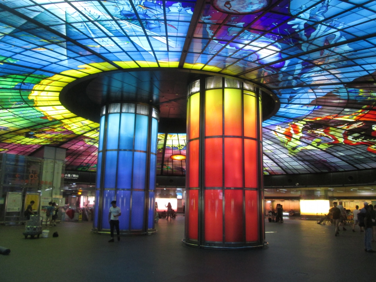 光之穹頂の見どころは満載で、中央部で支える2本の柱、天井に張り巡らされたステンドグラス、周りを囲むようにして配置された16本の柱でした。特に、ステンドグラスは芸術的で美麗島駅の改札を出たら目の前に広がる芸術作品のようでした。