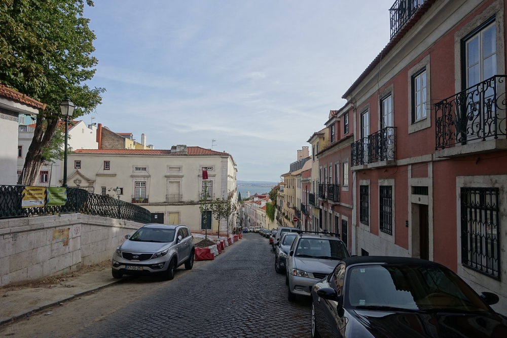 グラサ展望台から南へ下る坂道の通りです。遠くにわずかですがテージョ川も見え、よく見るとサンタルジア教会の鐘楼も見えていました。