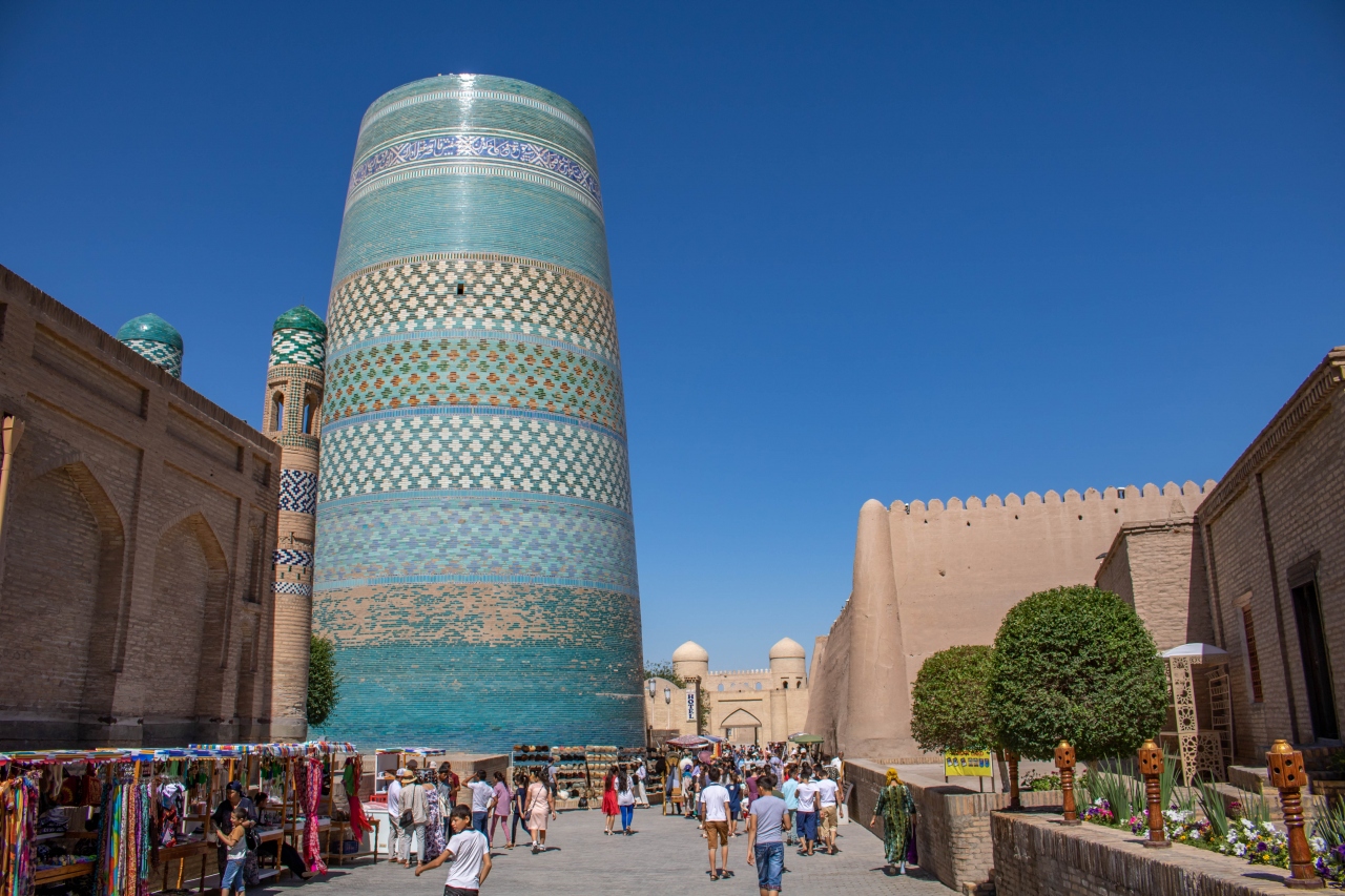 未完成のミナレット。元々中央アジアで最も高いミナレットになる予定が、建築を命じたハン(王のこと)が戦死したことで工事が中断されてしまい、こんなずんぐりとした姿になった。今の高さは26mと計画の5分の1にも満たないが、ヒヴァという街のスケールを考えるとちょうど良い大きさのようにも思います。