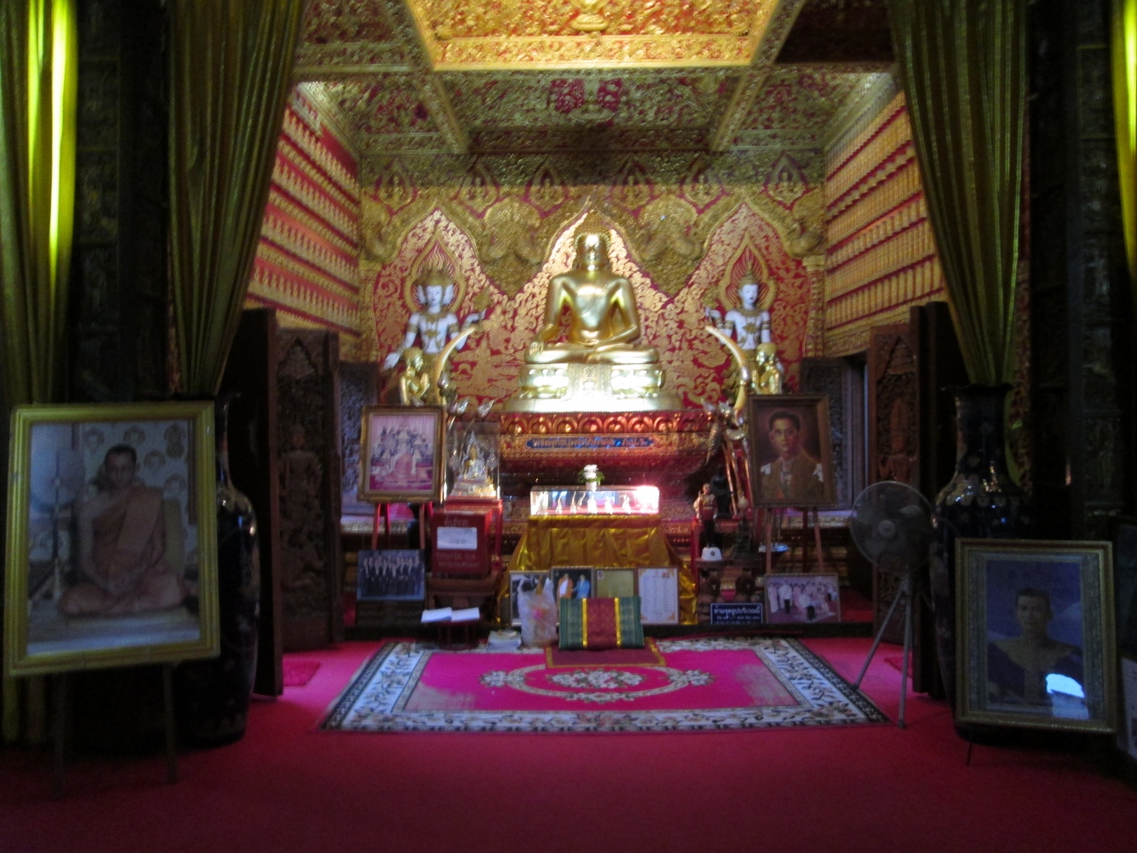 ワット ブッパラムの境内は自由に入場でき、本堂には靴を脱いで見学しました。本堂の仏像が置かれているエリアは金色に塗られており、ここの仏像は金ピカに輝くボディーで、むき出しになっていたのが特徴的でした。周りには、プミポン国王の写真、しかも若い頃の写真が飾られておりタイらしい光景でした。